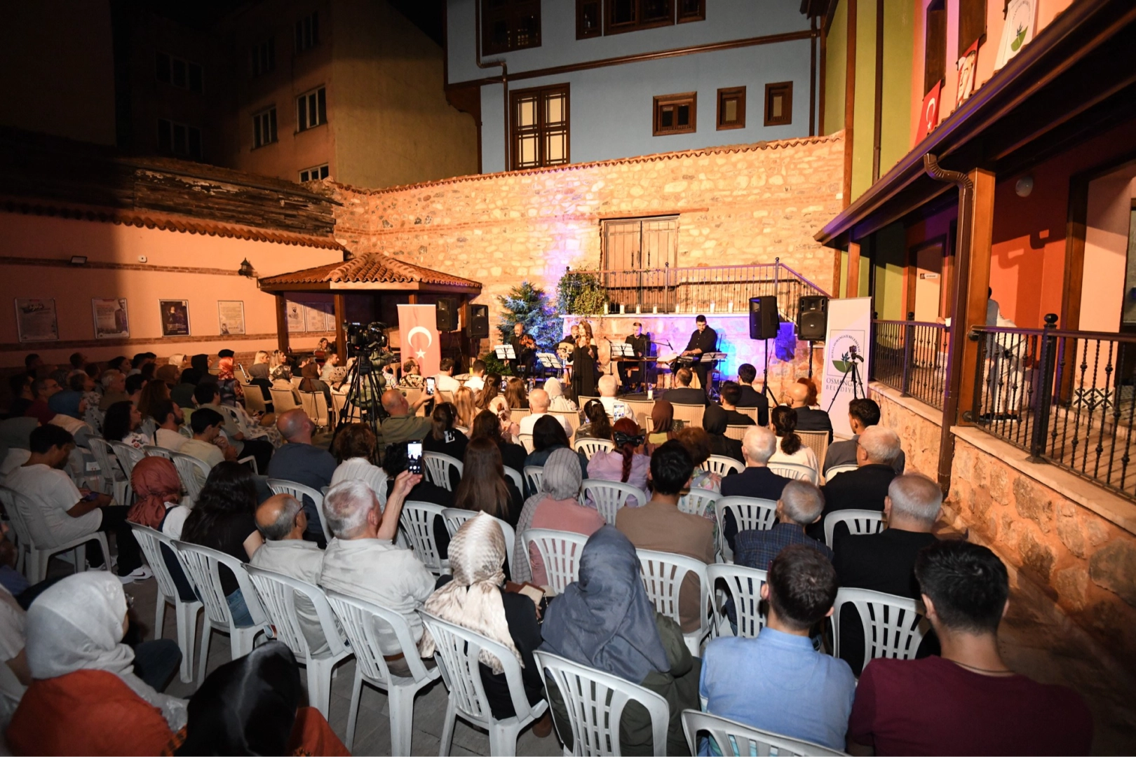 Osmangazi Belediyesi, ‘Şadırvanlı Han Avlu Buluşmaları’ adı altında düzenleyeceği etkinlikler ile Osmangazililere kültür sanat dolu akşamlar yaşatacak. Birbirinden güzel programların yer aldığı ‘Şadırvanlı Han Avlu Buluşmaları’ etkinlikleri, Eylül’ün Nağmesi Türk Sanat Müziği Konseri ile başladı. Şadırvanlı Han’da gerçekleştirilen konsere musiki severler yoğun ilgi gösterdi. Birbirinden değerli saz sanatçılarından oluşan orkestra ile birlikte sahneye çıkan Solist Gülce Kureyş, yaklaşık iki saat süren konserde bir çok usta bestekarın eserlerini Osmangazililer için seslendirdi. 18 parçanın icra edildiği konser ‘Kalbim Kanıyor Durmadan En Tatlı Çağında’ adlı eser ile başladı. Şadırvanlı Han’ı dolduran musiki severler, kürdili hicazkar, hicaz ve nihavend makamında seslendirilen şarkılara hep birlikte eşlik etti. Konser bitiminde orkestra ve Solist Gülce Kureyş, dakikalarca ayakta alkışlandı.