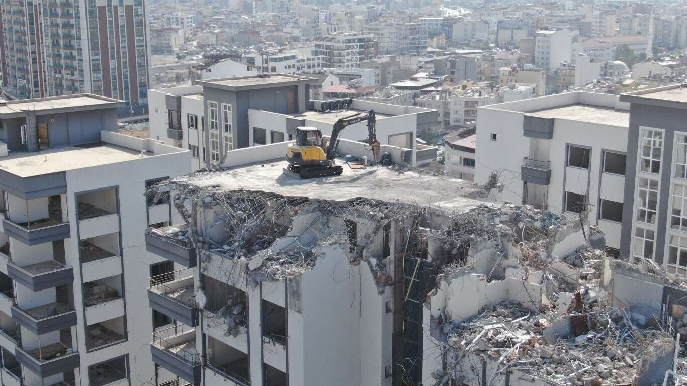 Depremin vurduğu Hatay’da 13 katlı lüks site, tepesine iş makinesi çıkarılarak yıkılmaya başlandı. Bina tepesindeki iş makinası, vatandaşların da ilgi odağı oldu.