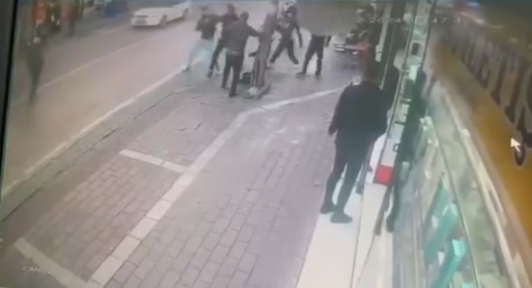 Tarafları çevredekiler güçlükle ayırırken, kavga anı bir işyerine ait güvenlik kamerasına yansıdı.