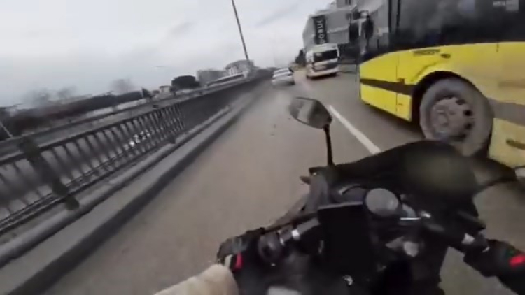 Olay, merkez Yıldırım ilçesi Ankara yolu üzerinde meydana geldi. Biranda hızlanan motosiklet sürücüsü, otobüse çarpmamak için solundan giden otomobilin önüne geçtiği an direksiyon hakimiyetini kaybetti. Sağa ve sola doğru yalpalayan motosiklet, sürücüsü kısa bir süre sonra direksiyonu toplamasıyla yoluna devam etti. Yaşanan korku dolu anlar, motosikletlinin kask kamerasına yansıdı.