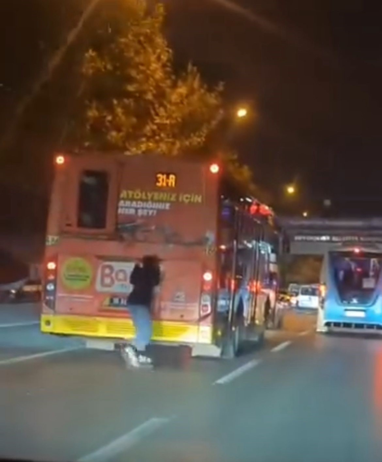Seyir halindeki otobüsün arka bölümüne tutunarak patenle ilerleyen genç, uzun süre bu şekilde yolculuk yaptı. Tehlikeli anlar, çevredeki bir vatandaşın cep telefonu kamerasına saniye saniye yansıdı