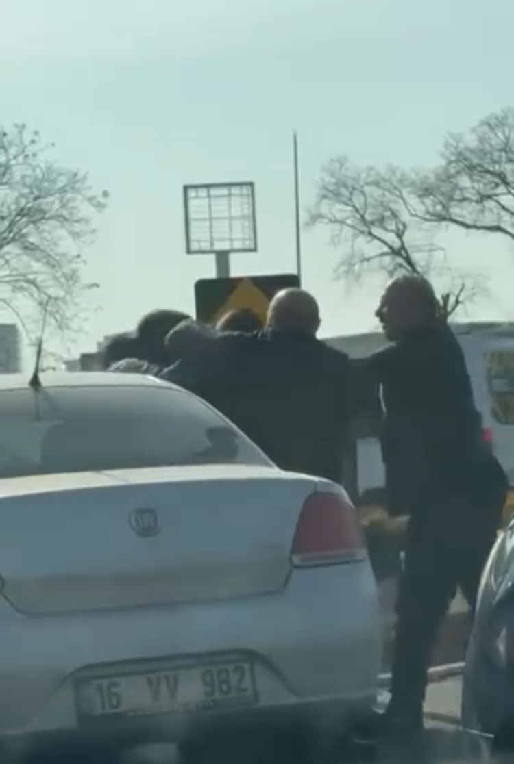 Olay merkez Osmangazi ilçesi İzmir Yolu caddesi Acemler mevkiinde meydana geldi. İddiaya göre, yoğun trafikte ilerlemeye çalışan iki sürücü yol verme meselesi nedeniyle sözlü tartışmaya başladı. Kısa sürede büyüyen tartışma kavga dönünce, öfkeli taraflar araçlarından inip bir birlerine tekme tokat vurmaya başladı. Öfkeli tarafların caddeyi ringe çevirdiği anlar kameraya yansırken, tarafları çevredekiler ayırdı.