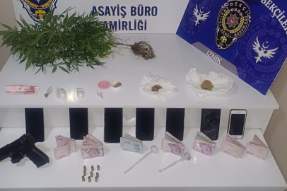 Bursa İl Emniyet Müdürlüğü'ne bağlı İznik İlçe Emniyet Müdürlüğü'ne bağlı ekipler ile gece kartalları, Selçuk Mahallesinde durumundan şüphelendiği 7 şüpheliyi durdurdu. Şüphelilerin teker teker sorgulamaları yapıldı. Sorgularının ardından alınan izinlerin doğrultusunda şüphelilere ait olan eve polis operasyon düzenledi. Yapılan operasyonda 32 gram metamfetamin, 17 gram esrar, 1 adet 65 santimetre boyunca Hint keneviri ve tabanca ile mermi ele geçirdi. 3'ü kadın 7 şüpheli gözaltına alınarak İznik İlçe Emniyet Müdürlüğü'ne götürüldü.