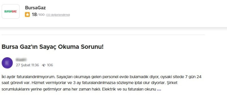 "İki aydır faturalandırılmıyorum. Sayaçları okumaya gelen personel evde bulamadık diyor, oysa ki sitede 7 gün 24 saat görevli var. Hizmet vermiyorlar ve 3 ay faturalandırılmazsa sözleşme iptal olur diyorlar. Şirket sorumluluklarını yerine getirmiyor ama her zaman haklı. Elektrik ve su faturaları okunuyor ama çok gariptir ki Bursa Gaz okuyamıyor. Herkes işini yapsın."