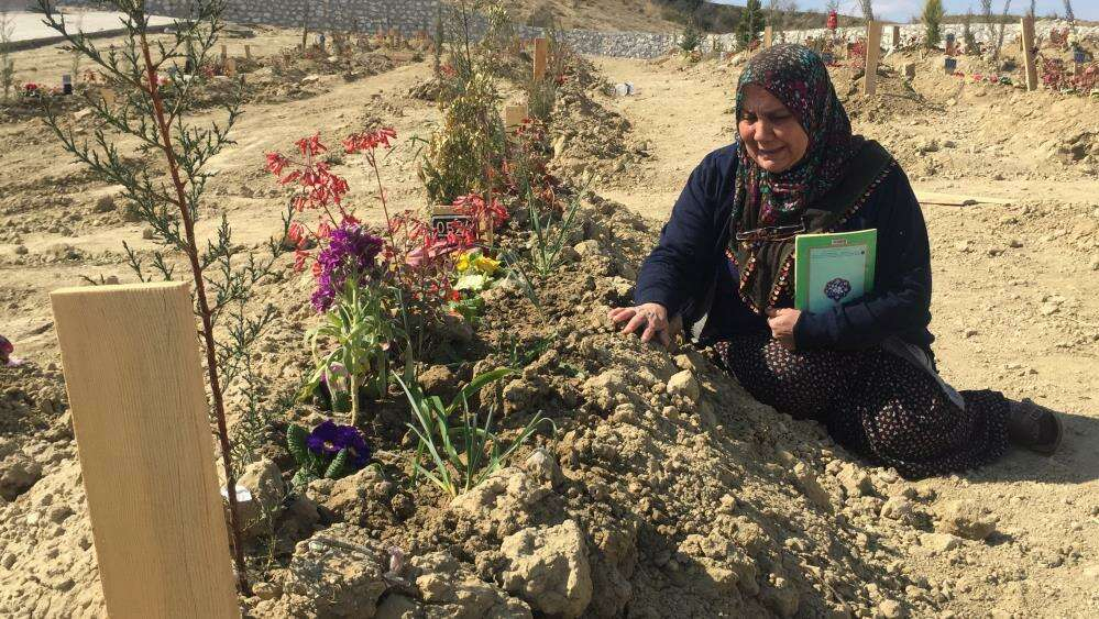 Depremde iki kızı, bir torunu ve damadını kaybeden annenin, mezara sarılıp öperek, “Ben hanginize sarılayım, hanginizle hasret gidereyim. Ben sana gelinlik giydirecektim kefen giydin” diyerek gözyaşlarına boğulması yürekleri dağladı.