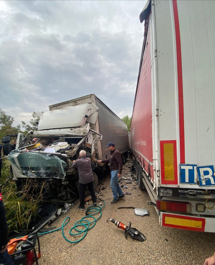 Bursa'nın İnegöl ilçesinde meydana gelen kazada 2 kamyon kafa kafaya çarpıştı; 1 sürücü yaralandı.