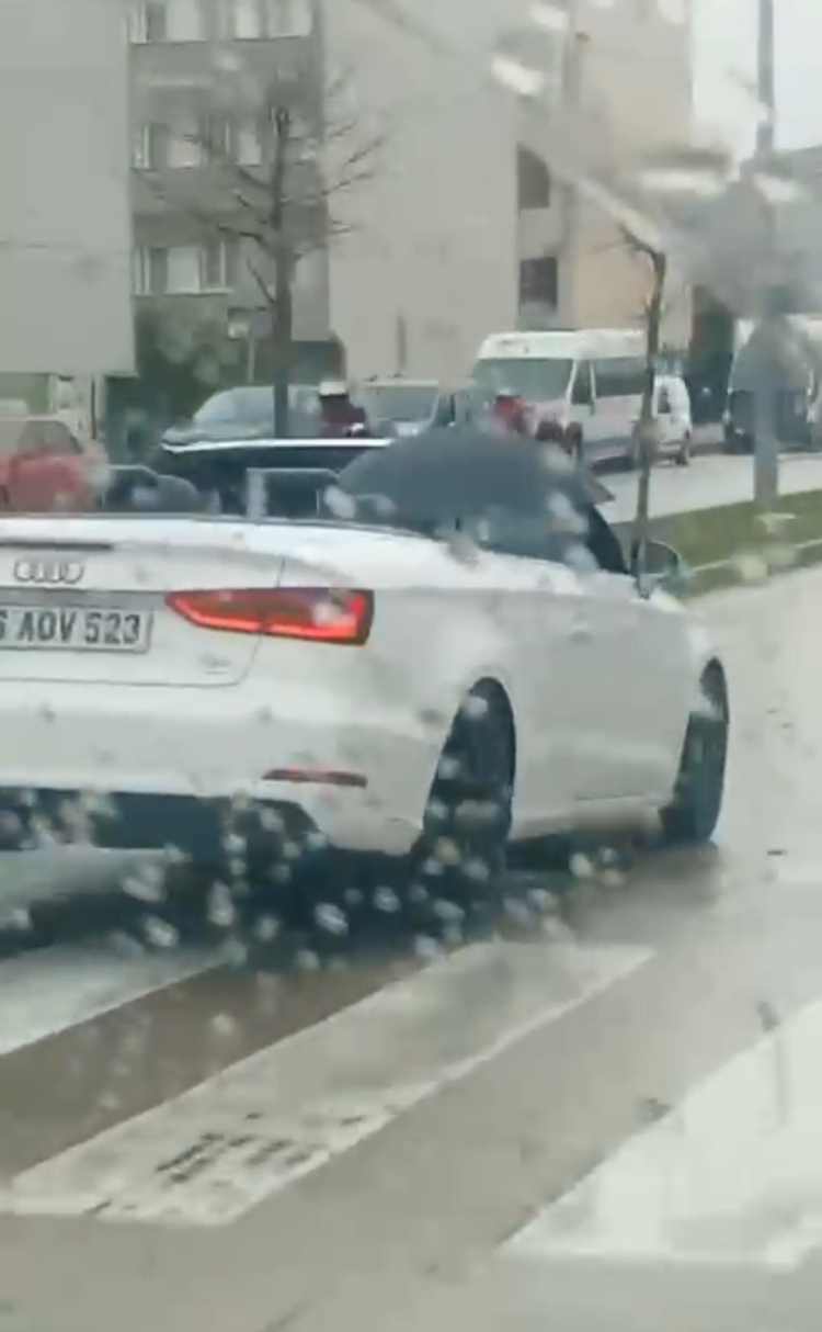 Bursa'da şehir merkezinde üstü açık lüks spor aracıyla seyahat eden bir sürücü, yağmurun başlamasıyla birlikte açılır tavanı kapatmak yerine şemsiyesiyle yola devam etti. O anlar kameraya yansıdı.