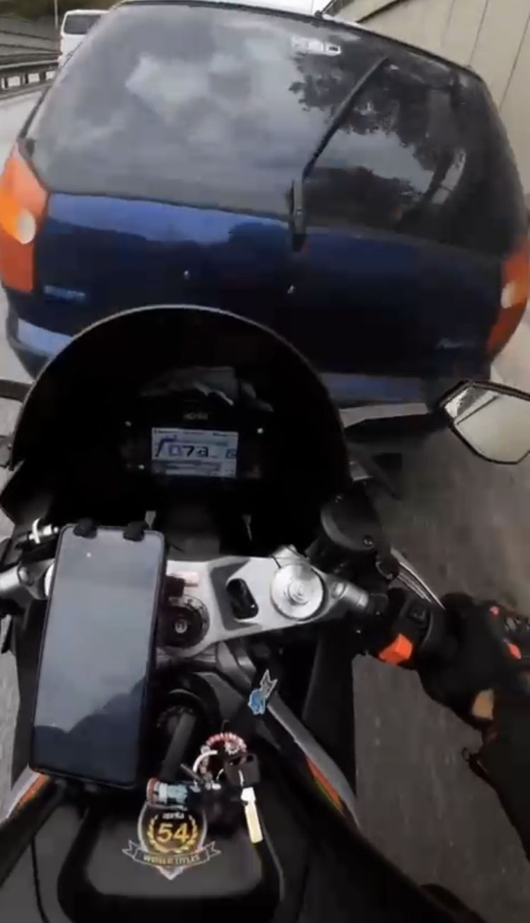 Olay, merkez Osmangazi ilçesinde yaşandı. Edinilen bilgiye göre, motosiklet sürücüsü ana yolda ilerlediği sırada, yan şeritteki otomobil bir anda önüne kırdı. Fren yapmakta geciken motosikletli, otomobile çarptı. Çarpmanın etkisiyle motosikletli yere savrulurken, kazayı hafif sıyrıklarla atlattı. Kask kamerasına yansıyan görüntülerde, otomobilin ani manevrası ve çarpışma anı net bir şekilde görülüyor.