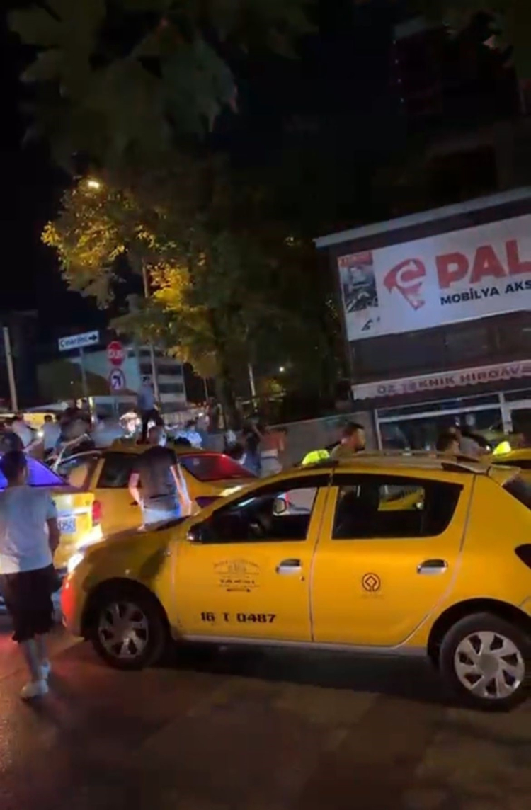 Bursa'nın Yıldırım ilçesinde bir taksiye binen kişi ile taksi şoförü arasında tartışma çıktı. Çıkan tartışma sonucu kavgaya tutuşan ikili seyir halindeyken, araç şoförü panik butonuna bastı. İhbar üzerine polis aracı takibe aldı. Yüksek İhtisas Kavşağında aracı yakalayan ekipler, ikili arasındaki kavgayı ayırmak isterken, olay yerine taksicinin meslektaşları geldi.