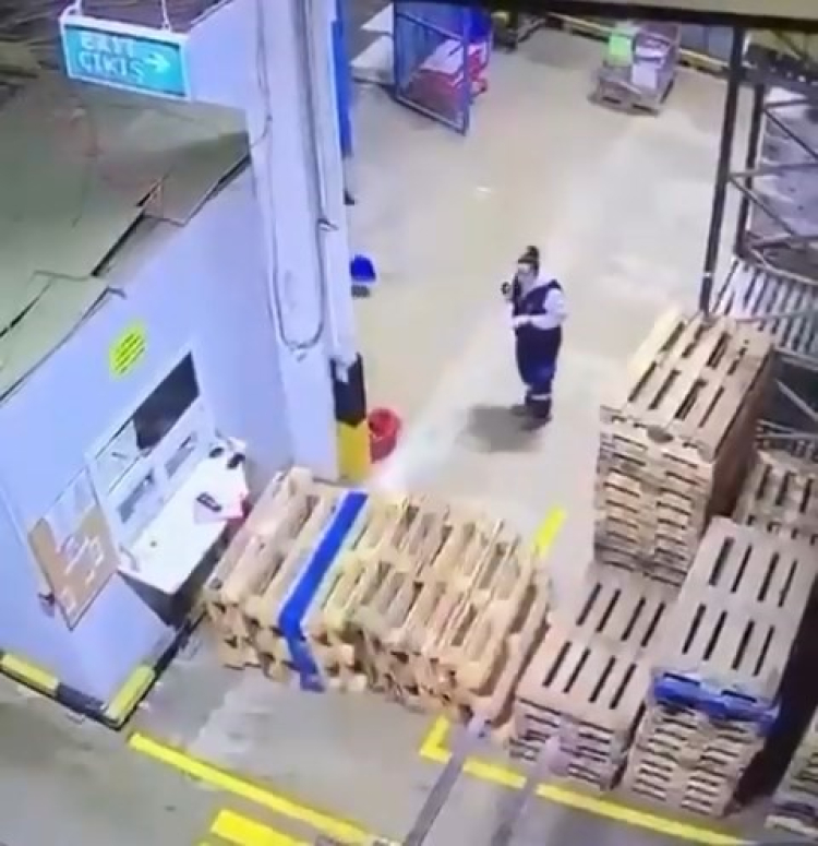 Bursa'da forklift tarafından üst üste dengesiz yerleştirilen paletler, devrildi. O esnada paletlerin yanında olan bir kadın çalışan, refleksi sayesinde paletlerin altında kalmaktan kurtuldu.