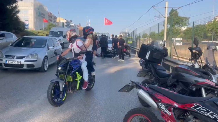 Trafik durunca, aradan ilerleyen motosikletler birbirine girdi