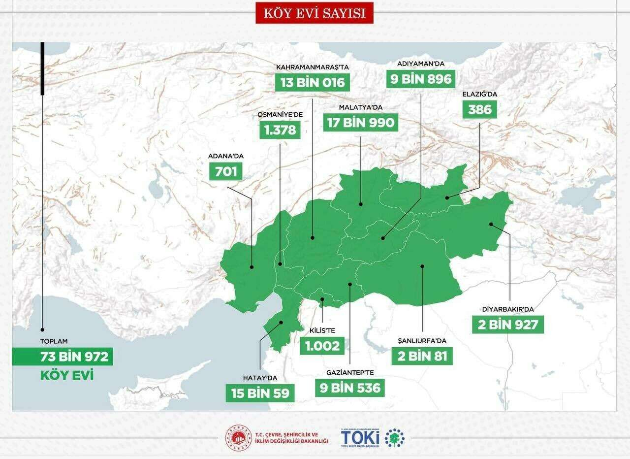 Merkez üssü Kahramanmaraş olan yıkıcı depremlerin ardından bölgedeki yıkılan köy evlerinin yeniden inşa edileceğini açıkladı. Bakan Kurum'un konuya ilişkin olarak yaptığı sosyal medya paylaşımında,” Deprem bölgemizi ihya ve inşa sürecinde 73 bin 972 köy evi yapacağız. Güvenli, sağlıklı, yöreye uygun evlerimizi ahırı, bahçesi, özgün mimarisi ile inşa edeceğiz” dedi.