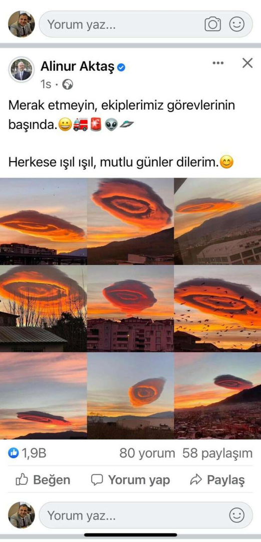 Bursa’da sabah saatlerinde görülen ve UFO’ya benzetilen mercek bulutlarla ilgili Bursa Büyükşehir Belediye Başkanı Alinur Aktaş da paylaşım yaparak, olumsuz bir durumun olmadığına dikkat çekti.
