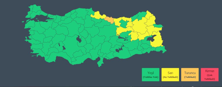 Ordu için turuncu uyarı verilirken Ağrı, Ardahan, Bayburt, Bingöl, Erzincan, Erzurum, Giresun, Kars, Muş, Samsun, Trabzon ve Van ise sarı uyarı verilen iller olarak sıralandı.