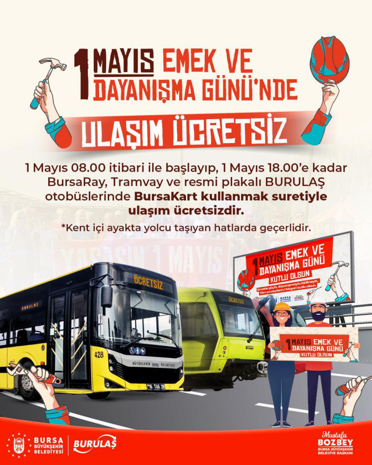 Bursa Büyükşehir Belediye Başkanı Mustafa Bozbey, tüm emekçilerin 1 Mayıs İşçi Bayramı’nı kutladı. Bursa Büyükşehir Belediyesi olarak emeğin ve emekçinin yanında olmaya devam edeceklerini söyleyen Başkan Mustafa Bozbey, "1 Mayıs Emek ve Dayanışma Günü’nde kutlama ve etkinliklerin coşkulu kalabalıklarla yapılabilmesi amacıyla BursaRay ve tramvay hatları ile resmi plakalı Burulaş otobüsleri, 1 Mayıs 2025 Perşembe günü 08.00 ile 18.00 saatleri arasında BursaKart kullanmak suretiyle ücretsiz olarak hizmet verecektir" dedi.