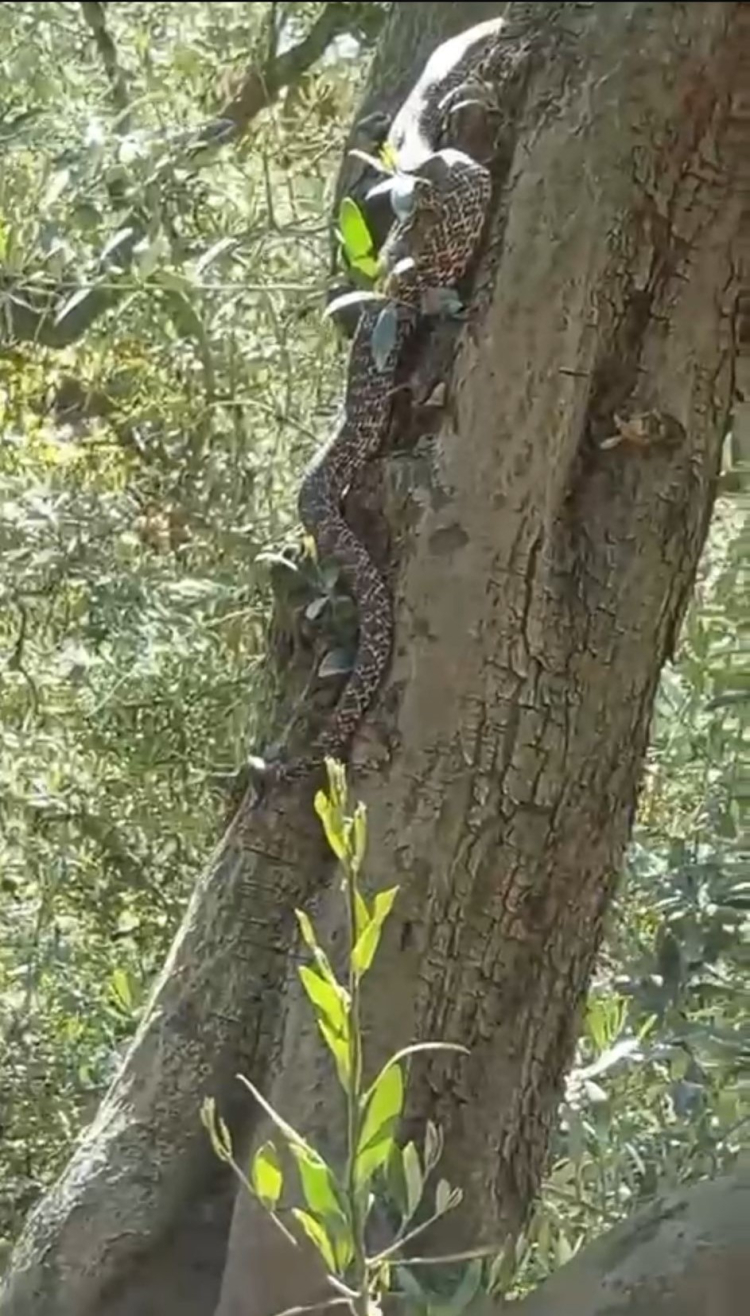 Bursa'nın İznik ilçesinde zeytin ağacının üstünde görülen 2,5 metre uzunluğundaki yılan cep telefonu kamerasına yansıdı.