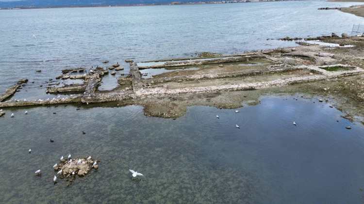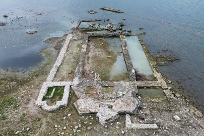 Marmara Bölgesi'nin en büyük gölü olan İznik Gölü'nde 10 yıl önce 2 metre derinlikte keşfedilen 2 bin yıllık bazilika, kuraklıkla birlikte artık tamamen su yüzeyine çıktı. Üzerinde ördeklerin gezdiği bazilika, dron ile havadan görüntülendi.