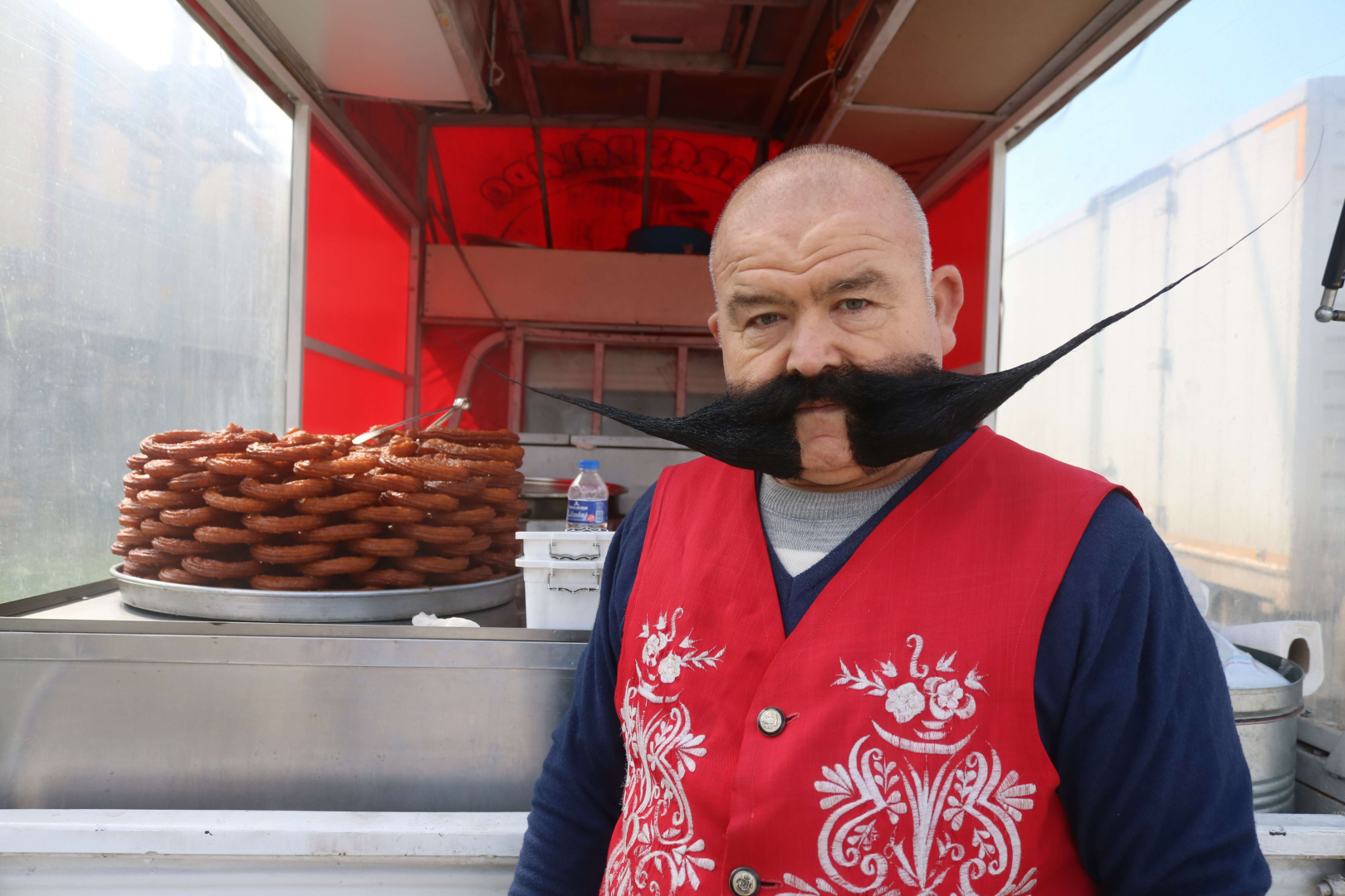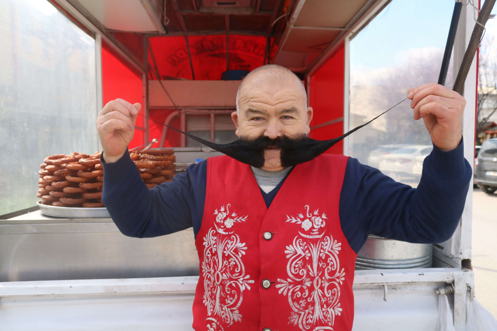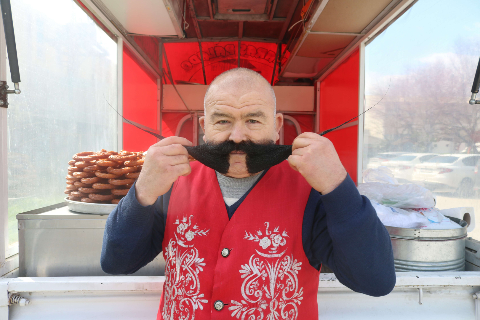 Bursa’da 40 yıldır tatlıcılık yaparak geçimini sağlayan 55 yaşındaki ‘Pala’ lakaplı Ramazan Demir, dedesine özenip bıyık bırakmaya başladı. 25 yıldır uzattığı bıyığı 80 santimetreye ulaşan Demir, 4 yıl önce kesip kısalttığı bıyıklarını pişman olup tekrar uzattığını söyledi.