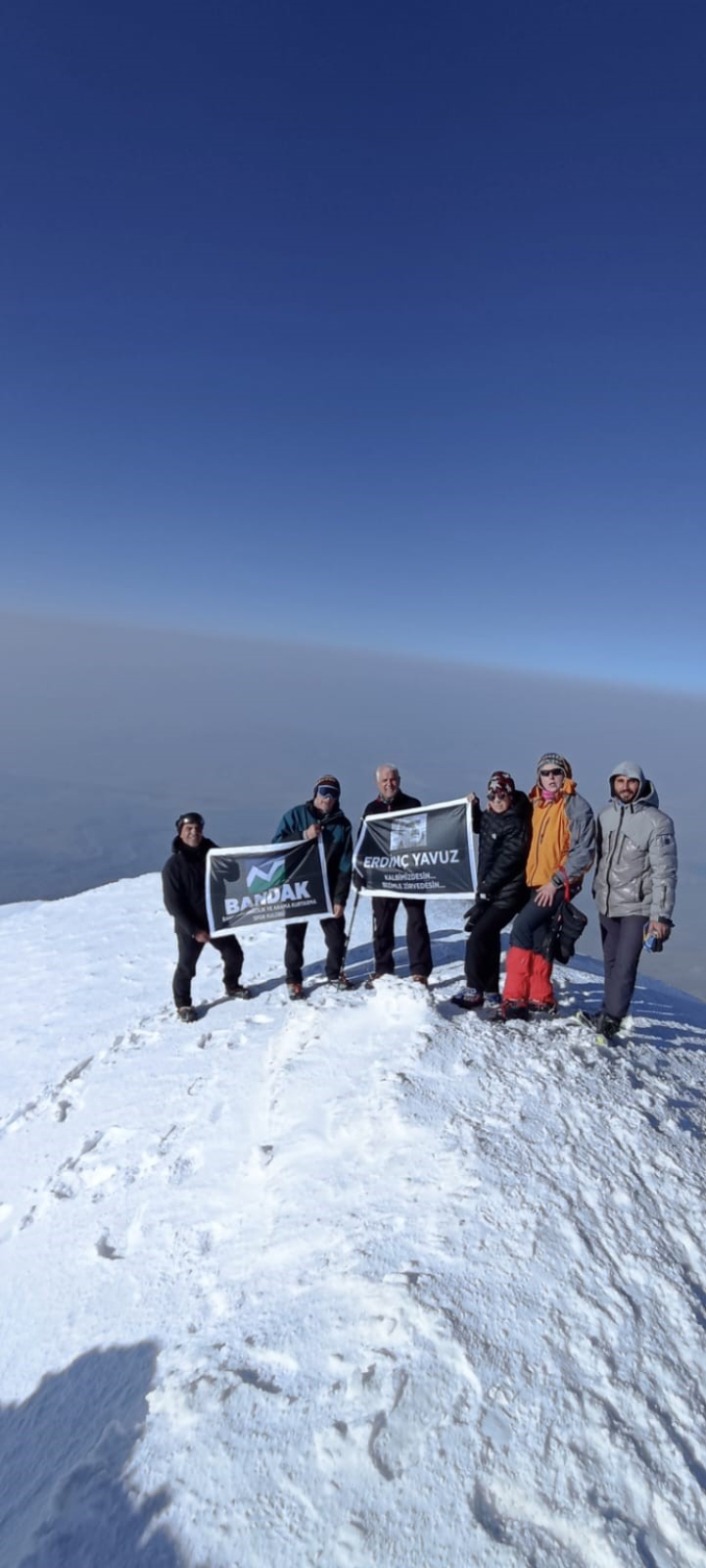 Zirveye çıkan dağcılar BANDAK bayrağı ile üzerinde Erdinç Yavuz'un fotoğrafının bulunduğu ve “Kalbimizdesin, bizimle zirvedesin” yazılı pankart açtı.