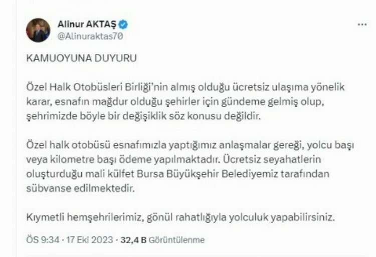 Başkan Aktaş sosyal medya hesabı üzerinden yaptığı açıklamada şu ifadelere yer verdi: "Özel Halk Otobüsleri Birliği'nin almış olduğu ücretsiz ulaşıma yönelik karar, esnafın mağdur olduğu şehirler için gündeme gelmiş olup, şehrimizde böyle bir değişiklik söz konusu değildir. Özel halk otobüsü esnafımızla yaptığımız anlaşmalar gereği, yolcu başı veya kilometre başı ödeme yapılmaktadır. Ücretsiz seyahatlerin oluşturduğu mali külfet Bursa Büyükşehir Belediyemiz tarafından sübvanse edilmektedir. Kıymetli hemşehrilerimiz, gönül rahatlığıyla yolculuk yapabilirsiniz."