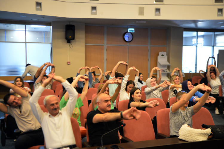Fizyoterapist Pınar Aydeniz yaptığı bilgilendirmenin ardından masa başında çalışanların mutlaka yapması gereken kültür-fizik hareketlerini uygulamalı olarak gösterdi.