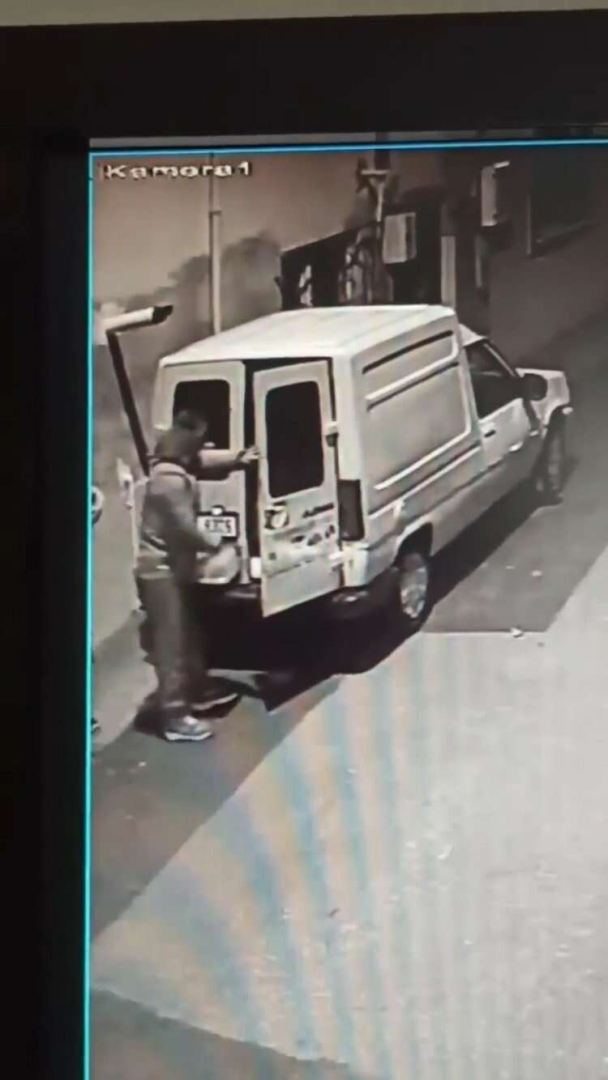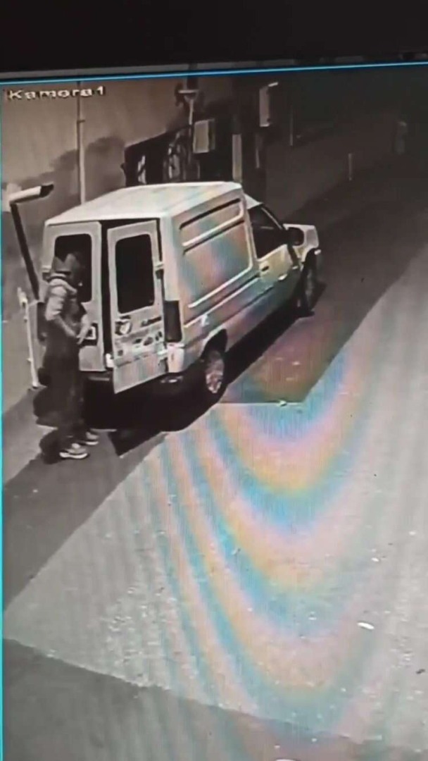 Bir süre keşif yaptıktan sonra kamyonetten inen hırsız, dükkanın önünde bulunan sobayı kamyonetin kasasına yükleyerek uzaklaştı.