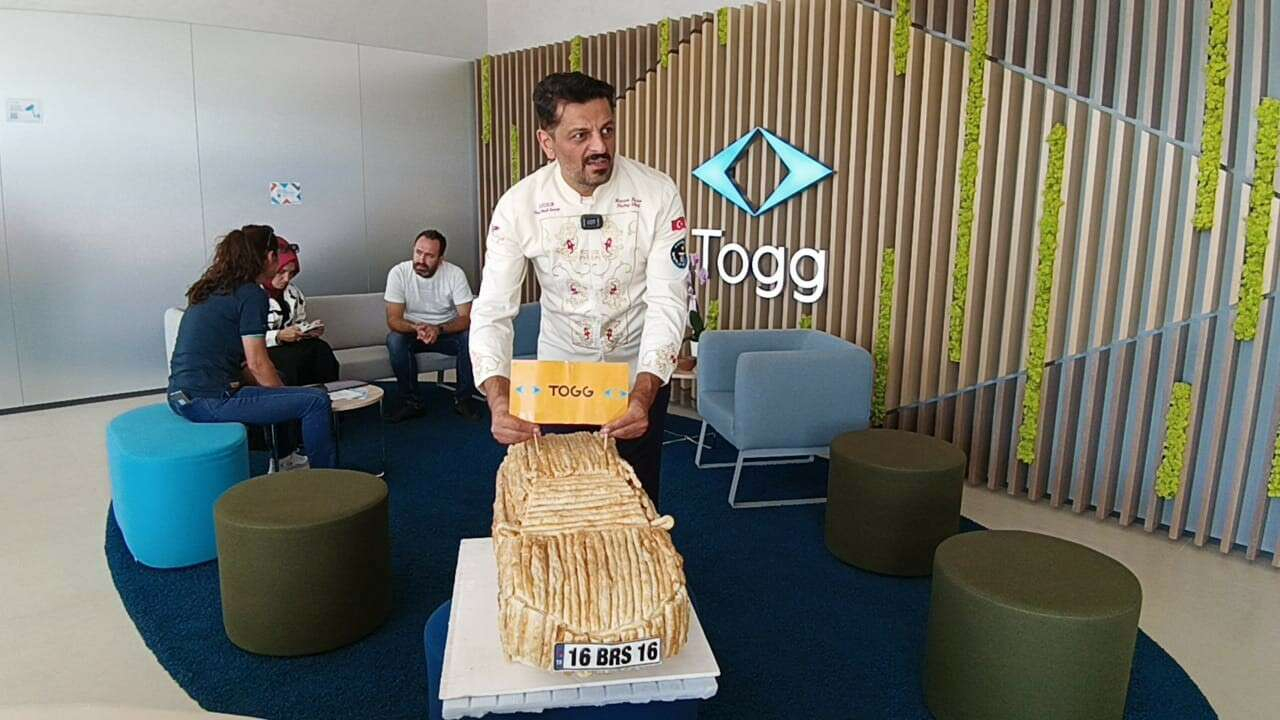 Bursa'lı rekortmen börekçi Hasan Acar, 177 bin başvuru arasından 4 bin 951'inci şanslı kişi olarak kendisine çıkan Togg otomobilini almaya börekten yaptığı Togg ile gitti. Börek Togg'u verip gerçeğini teslim alan Hasan usta Togg çalışanlarına da börek ikram etti.