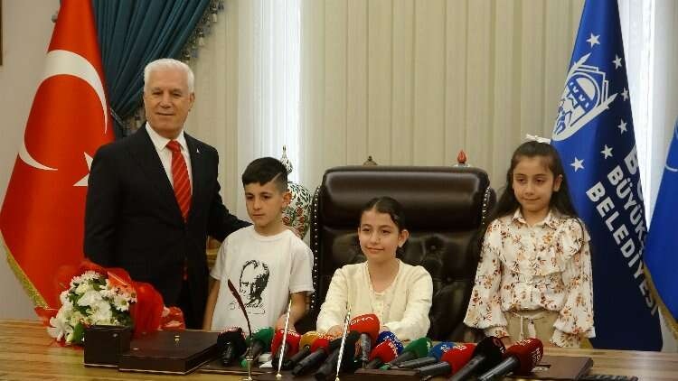 Bursa’da yurt genelinde olduğu gibi 23 Nisan Ulusal Egemenlik ve Çocuk Bayramı coşku ile kutlanırken Bursa Büyükşehir Belediye Başkanı Mustafa Bozbey, koltuğunu çocuklara devretti. 10 yaşındaki Zeyna Defne Kesmez 1 günlüğüne Bursa Büyükşehir Belediye Başkanı oldu.
