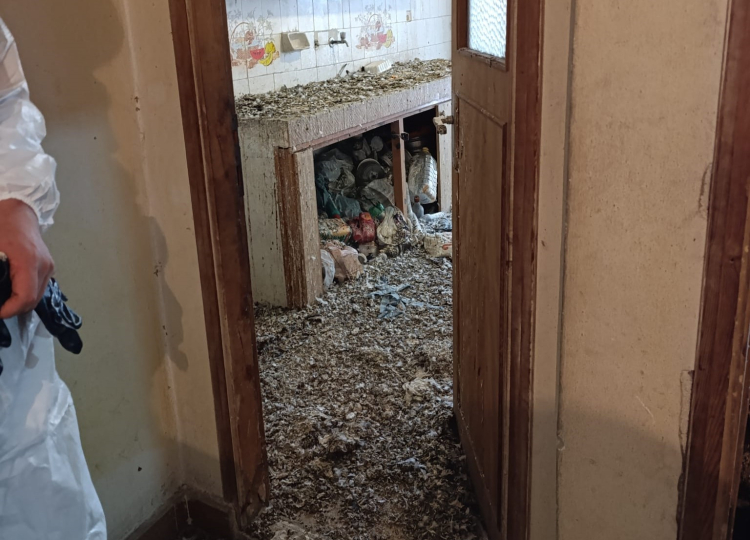Evin cam ve kapılarının uzun süredir açık olduğu, odaların kuşlarla dolduğu ve dairenin adeta kümese döndüğü görüldü. Temizlik sonrası ekipler evde ilaçlama ve dezenfekte çalışması gerçekleştirdi.