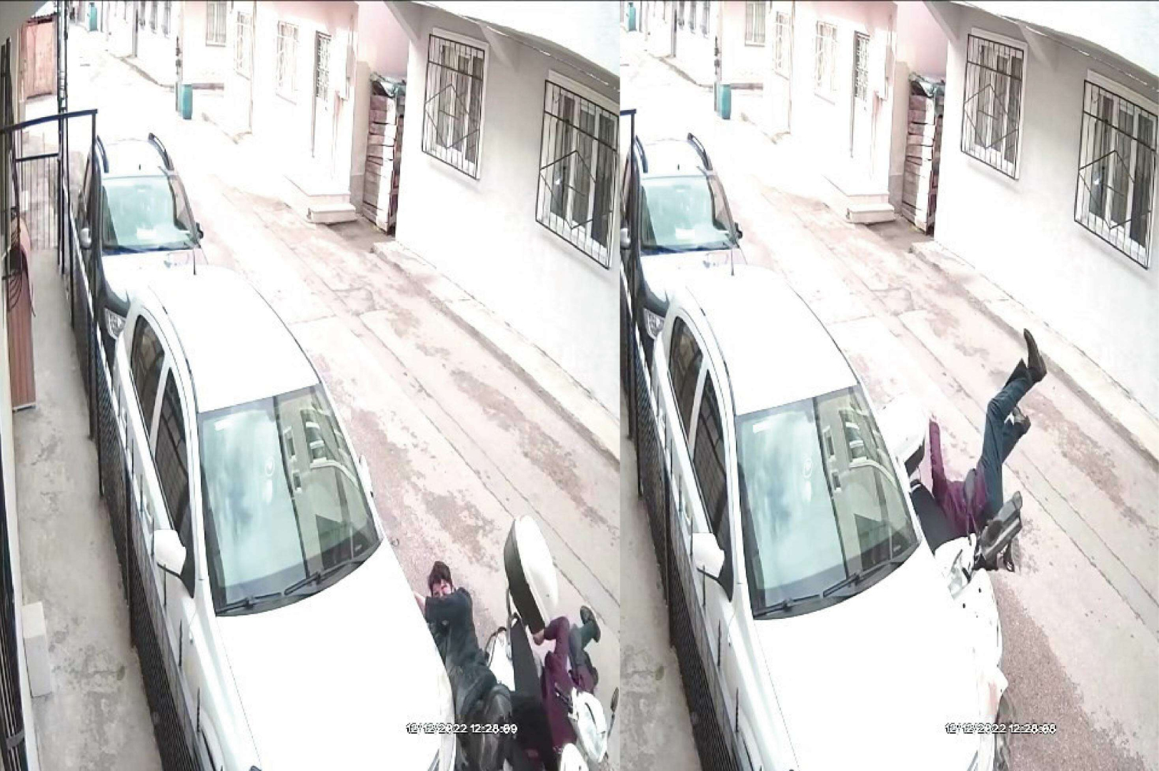 Kaza, merkez Osmangazi ilçesinde meydana geldi. Edinilen bilgiye göre, motosiklet sürücüsü sokaktan geçtiği esnada önce yayaya daha sonra ise park halindeki otomobile çarparak yere düştü. Yaya ve motosiklet sürücüsü hafif şekilde yaralanırken o anlar güvenlik kameralarına saniye saniye yansıdı.