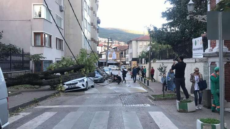 Bursa’da gün boyunca etkili olan şiddetli lodos, sabaha karşı bir ağacı ve elektrik direğini araçların üzerine devirdi. Devrilen ağaç ve elektrik direği araçlarda maddi hasar meydana getirdi.