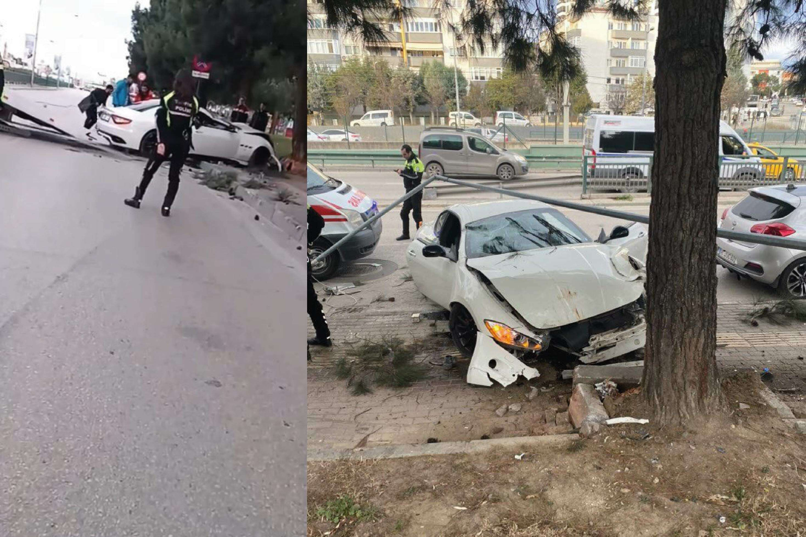 Bursa'da lüks otomobil ağaca çarparak pert oldu
