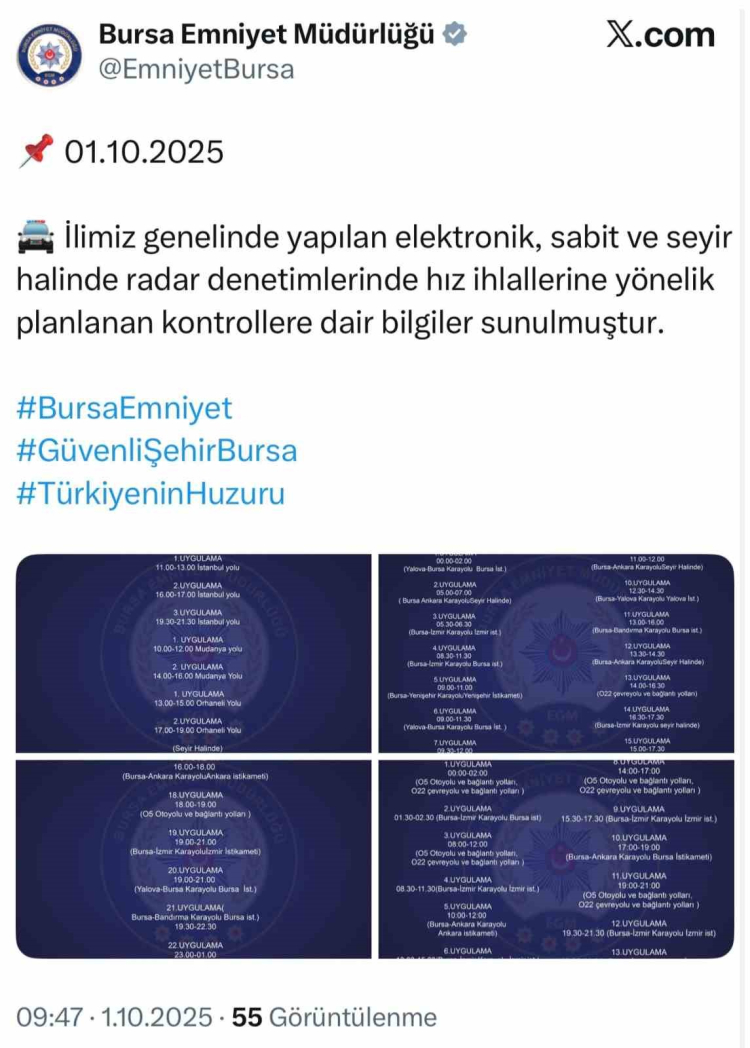 Bursa İl Emniyet Müdürlüğü, il genelinde gerçekleştirilen elektronik, sabit ve seyir halinde yapılan radar denetimlerine ilişkin yeni bir uygulamaya geçti. Buna göre Emniyet Müdürlüğü’nün sosyal medya hesaplarından denetim yapılacak noktalar ve saatleri açıklandı.