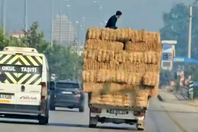 Bursa'nın İnegöl ilçesinde meydana gelen olayda istiflenen saman balyalarının üzerinde oturan gencin tehlikeli yolculuğunu görenler durumu hayretle izledi.