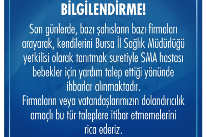 "Son günlerde, bazı şahısların bazı firmaları arayarak, kendilerini Bursa İl Sağlık Müdürlüğü yetkilisi olarak tanıtmak suretiyle SMA hastası bebekler için yardım talep ettiği yönünde ihbarlar alınmaktadır. Firmaların veya vatandaşlarımızın dolandırıcılık amaçlı bu tür taleplere itibar etmemelerini rica ederiz".