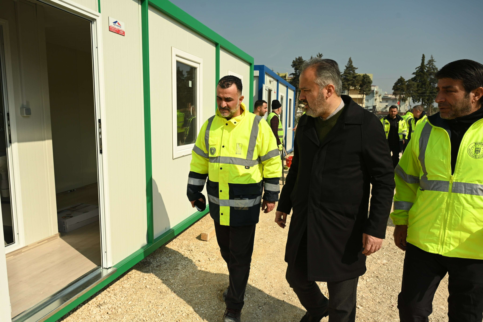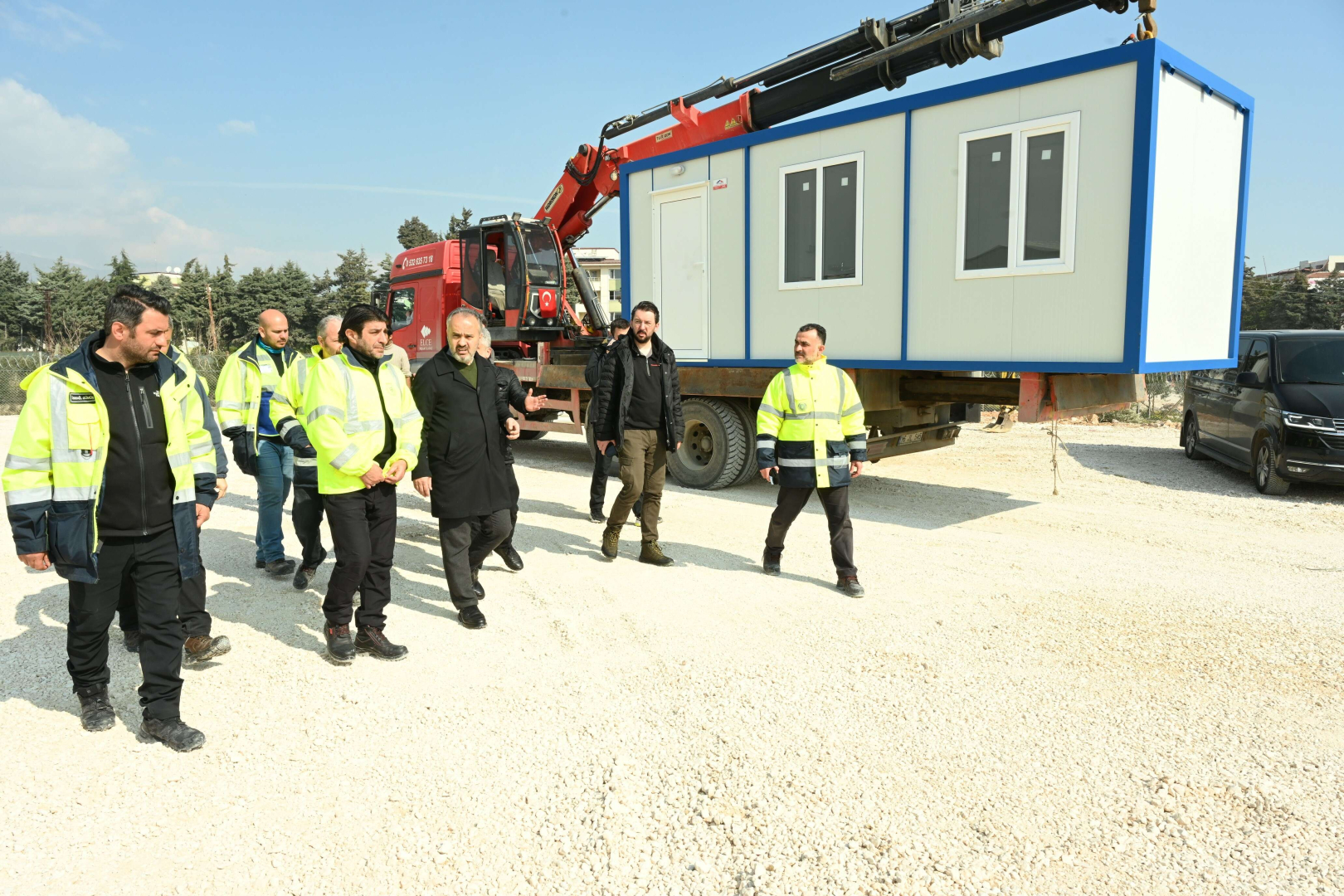 Depremin en yıkıcı etkilerinden birinin yaşandığı Hatay’daki görevlerinden biri de konteyner kentler kurulumu olan Bursa Büyükşehir Belediyesi, şehre ulaşan ilk konteynerlerin montajına başladı. Montaj çalışmalarını inceleyen Başkan Alinur Aktaş, “Hataylıların yüzünde biraz tebessüm olabilirsek, yaraları biraz sarabilirsek ne mutlu bize” dedi.