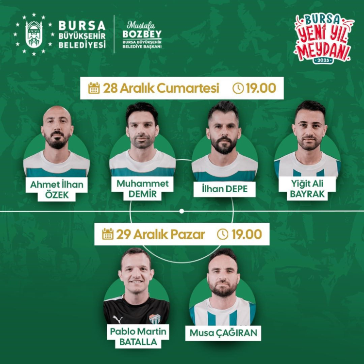 Bursaspor Teknik Direktörü Pablo Martin Batalla ile futbolcular, Büyükşehir Belediyesi tarafından Eski Atatürk Stadyumu alanında oluşturulan ‘Bursa Yeni Yıl Meydanı’nda taraftarlarla buluşuyor. Bursalıların 2025’in heyecanını dolu dolu yaşadığı meydanda düzenlenen konserler ve çeşitli etkinliklerle coşku yılın son gününe kadar devam ediyor.