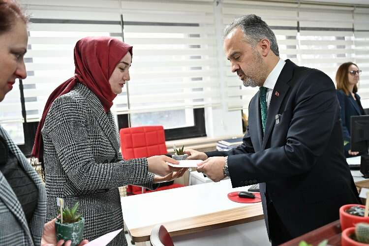 Bursa Büyükşehir Belediye Başkanı Alinur Aktaş, 8 Mart Dünya Kadınlar Günü dolayısıyla BUSKİ’de çalışan kadın personelleri ziyaret ederek çiçek ve hediye takdim etti.