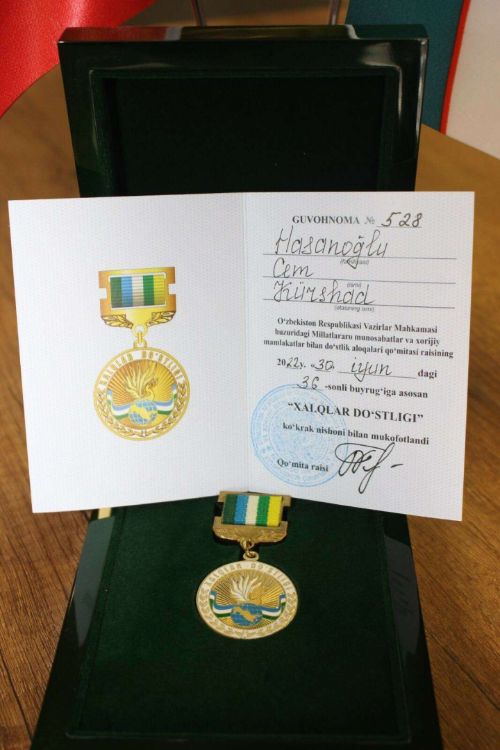 Cem Kürşad Hasanoğlu'nun nişanı düzenlenen törenle takdim edildi. Türk Dünyası'na yönelik yaptığı çalışmalar ve faaliyetlerle ön plana çıkan Hasanoğlu, "Özbekistan Bakanlar Kurulu kararıyla ‘Halklar Dostluğu Nişanı’ ile taltif edildim. Tensiplerinden dolayı başta Özbekistan Cumhurbaşkanı Shavkat Mirziyoyav’e, Ankara Büyükelçisi Alisher Agzamxodjaev’e, İstanbul Başkonsolosu aziz dostum Amirsaid Agzamxodjaev’e, aziz kardeşim Surayyo Khodjoeva’ya, Fahri Konsolosu Ali Baklan’a teşekkür ederim. Bu nişanın Türkiye’de ilk defa ve şahsıma verilmesi ayrı bir gurur ve mutluluk kaynağı oldu“ dedi.