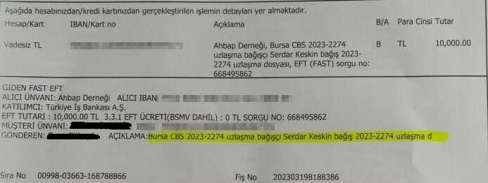 Bursa’nın Osmangazi ilçesi Kemerçeşme Mahallesi’nde esnaflık yapan Serdar Keskin, yaklaşık 3 ay önce trafikte bir kişi tarafından yumruklandı. Karşı taraftan davacı olan Keskin, arabulucunun devreye girmesi ile yeni bir süreç başlattı. Serdar Keskin, karşı tarafından depremzedelere 25 bin lira bağış yapmasının sonucunda davadan vazgeçeceğini arabulucuya iletti. Karşı taraf ilk etapta 20 bin lirayı kabul etti fakat yeni düğün yapacağı ve asgari ücretle geçindiğini belirterek bu rakamın 10 bin lira olmasını talep etti. Mağdur Serdar Keskin de davanın uzamaması ve avukat ücretlerinin çıkmaması için bu teklifi kabul etti. Karşı taraf 10 bin lirayı bir yardım derneği aracılığı ile depremzedelere gönderince Keskin davadan vazgeçti.