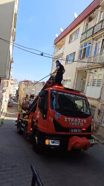 Yıldırım ilçesi Emirsultan Mahallesi Akgün Sokak üzerinde elektrik kablosuna konan kuş, ayağı takıldığı için hareket edemedi. Kurtulmak için çırpınan kuşu fark eden vatandaşlar itfaiye ekiplerini arayarak yardım istedi. İhbar üzerine olay yerine gelen Bursa Büyükşehir Belediyesi itfaiye ekipleri elektrik kablosunda mahsur kalan kuşu kurtardı.