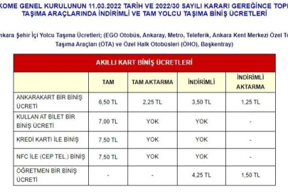 Bursa'da metrodaki tam bilet fiyatı 5,25 lira, indirimli 4,50 lira ve öğrenci 2,25 lira olarak uygulanırken, Ankara'da metro fiyatları 6,50 lira, 4,25 lira ve 3,50 liradır. Bu tarifeler, İstanbul'da tam bilet fiyatı 7,67 lira, indirimli 5,47 lira, öğrenci ise 3,72 lira olarak açıklandı.