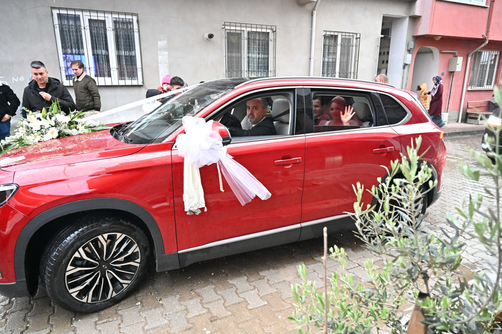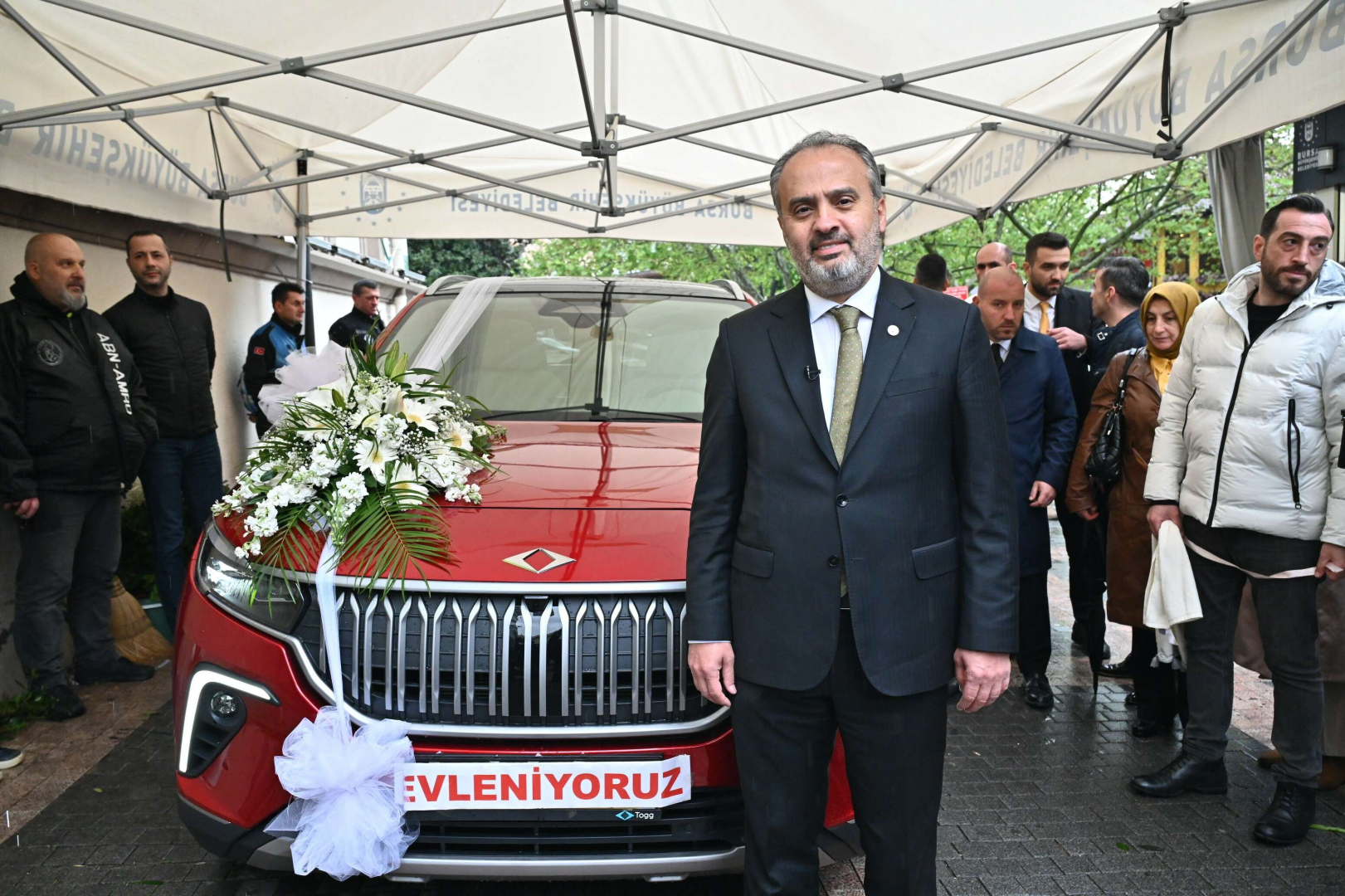 Bursa’dan milletvekili adayı olan Sanayi ve Teknoloji Bakanı Mustafa Varank, önceki gün bir kültür merkezi açılışında yanına gelen Hüseyin Özdemir’in düğünü olacağını öğrenince, jest yapıp kendisinin kullandığı Anadolu Kırmızısı Togg’u gelin arabası olacağının sözünü vermişti. Bakan Varank, sözünü tuttu ve aracı teslim ettiği Bursa Büyükşehir Belediye Başkanı Alinur Aktaş da şoförlüğünü yapacağı Togg’u süsletip, gelin arabasına dönüştürdü. Direksiyona geçen Başkan Aktaş, yanına aldığı damat Hüseyin Özdemir ile konvoy eşliğinde gelin Habibe Fatsa Özdemir'in Gemlik ilçesindeki evine geldi. Gelenekler gereği Türk Bayrağı açılarak, havai fişeklerle karşılanan konvoyda en büyük ilgiyi Türkiye’nin otomobili çekti. Gelin Habibe Fatsa Özdemir'i baba evinden dualar eşliğinde alan Başkan Aktaş, genç çifti düğün salonuna kadar götürdü.
