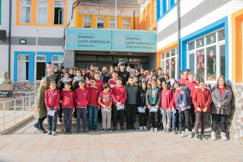Bursa İl Jandarma Komutanlığına bağlı ekipler Yıldırım ilçesi Samanlı Mahallesi’nde bulanan Latif Dörtçelik İmam Hatip Ortaokulu ve Mudanya ilçesine bağlı Bademli Mahallesi Necla Orhan İlk ve Ortaokulunda bulunan toplam 400 öğrenciyle bir araya geldi. Karnelerini almaya saatler kalan öğrenciler, iz takip köpeği “Makbuz”, uyuşturucu madde köpeği “Beta” ve mayın arama köpeği “Dorunun” yapmış olduğu sevimli gösteriye büyük ilgi gösterdi. Yapılan gösterinin ardından trafik jandarmaları temel öğrencilere trafik kuralları ve yaya geçidi kullanımı hakkında bilgi verdi. Motosikletli asayiş timlerince gösteri yapılırken, Siber Şube Müdürlüğü ekipleri tarafından siber farkındalık ve güvenli internet konusunda eğitim verildi. Öğrenciler ise hem eğlendi, hem bilgi sahibi oldu.