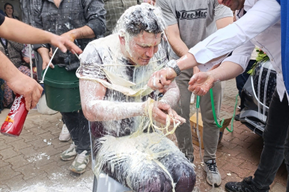 Arkadaşları, damadın başında yumurta kırıp, un, süt, ketçap ve mayonez döktü. Dakikalarca süren eğlence sonunda damat Sevinç, son olarak arkadaşları tarafından su dökülerek yıkandı. Görülmemiş eziyetin ardından damat düğüne uğurlandı.