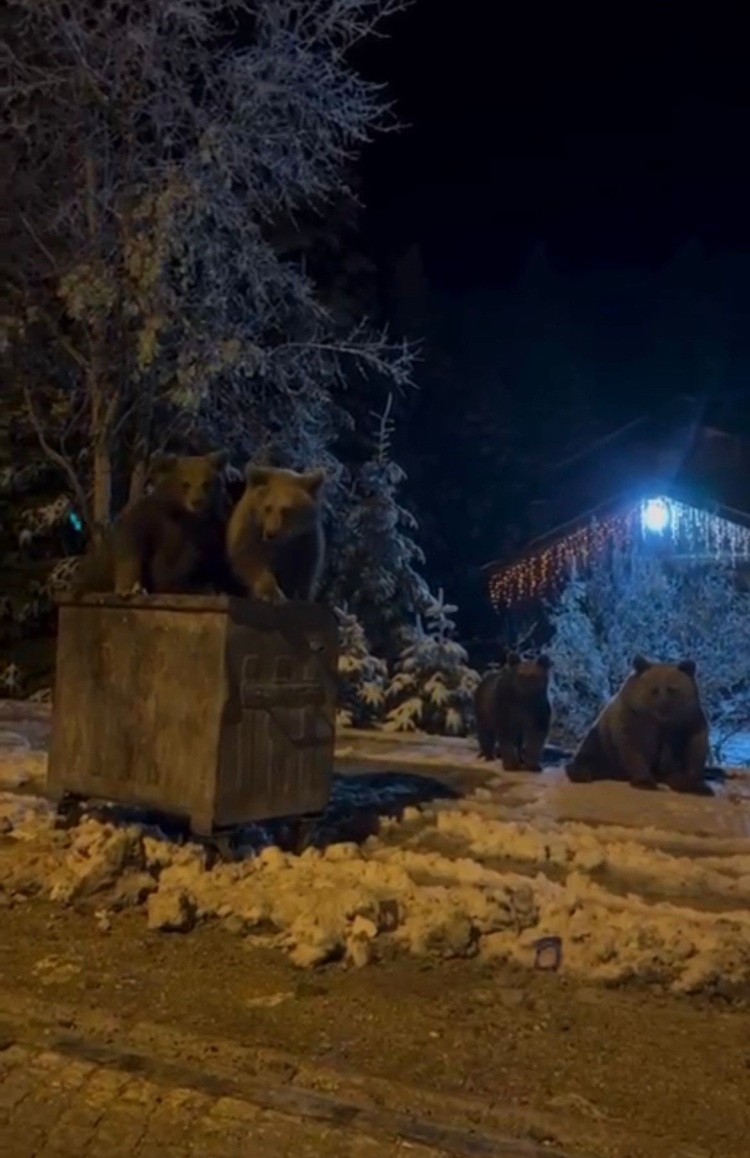 Bursa Uludağ'da yerleşim alanlarına inen ayılar, çöp konteynerlerinin üzerinde dolaştı. Çöp konteynerini karıştıran 1 anne ve 3 yavru ayının, bölgede kar yağmasına rağmen hala kış uykusuna yatmamaları dikkat çekti.