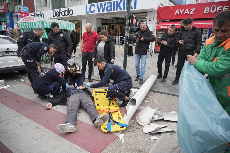 Bursa'da şiddetli lodos sebebiyle çatıdan kopan gider borusu, trafik lambası altında bekleyen adamın kafasına düştü. Kanlar içerisinde yere yığılan adam, vatandaşların ilk müdahalesinin ardından hastaneye kaldırıldı.