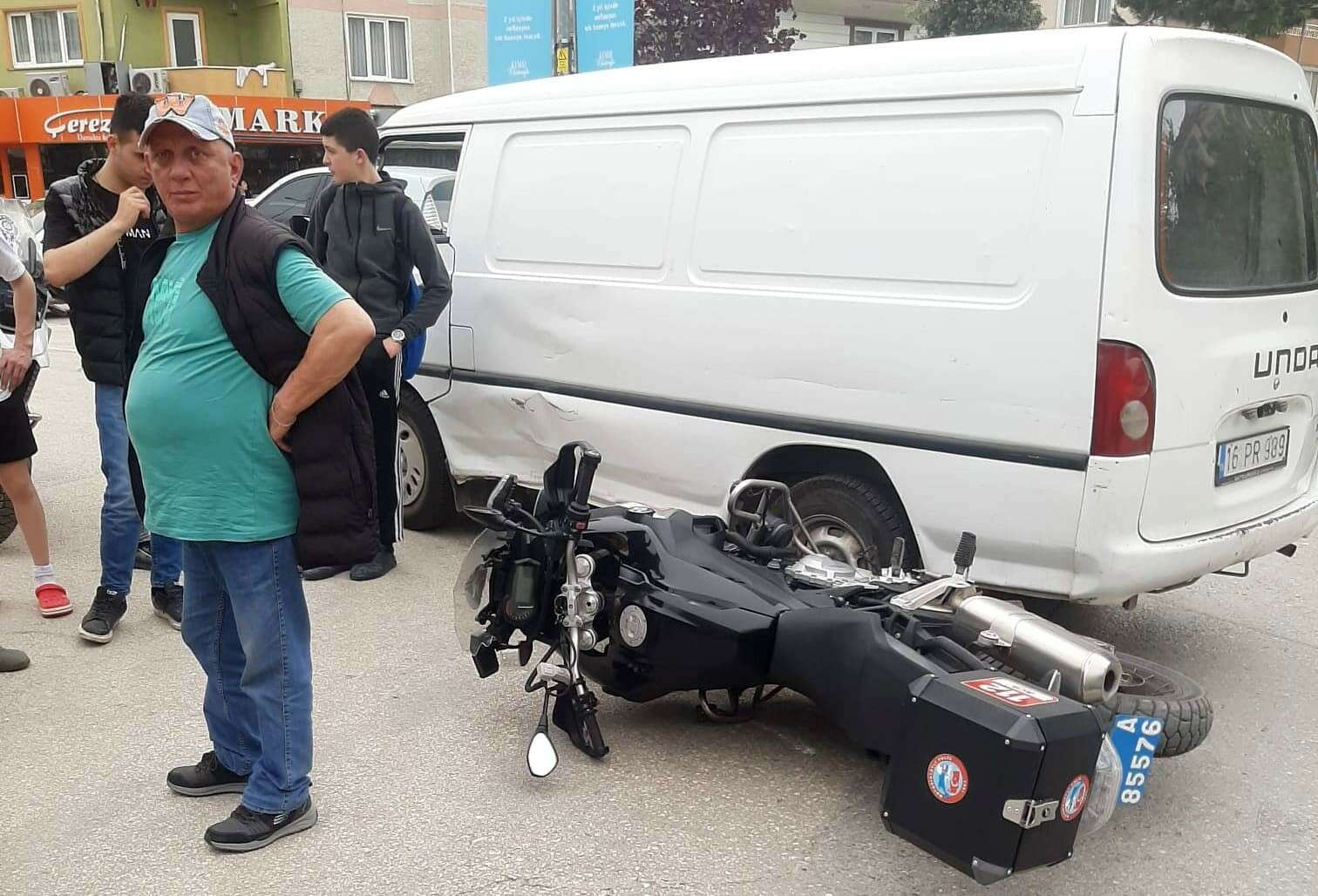 Kaza, saat 16.00 sıralarında Hamidiye Mahallesi Anafartalar Caddesi'nde meydana geldi. Cadde üzerinde devriye atan polis memuru Rıdvan S. (39) yönetimindeki motosiklet, Kurtuluş Sokak'tan aniden yola çıkan sürücü Raif Ü. (60) idaresindeki 16 PR 989 plakalı minibüse yandan çarptı. Çarpmanın etkisiyle devrilen motosikletten düşen polis memuru yaralandı. Kaza sonucu olay yerine çok sayıda polis ile 112 ekibi sevk edildi. Yaralanan polis memuru, ambulansla İnegöl Devlet Hastanesine kaldırıldı. Polisin sağlık durumunun iyi olduğu öğrenildi.