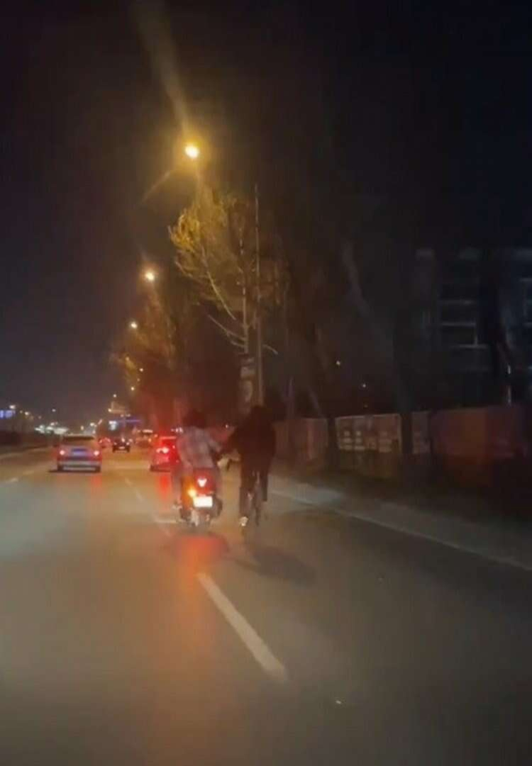 Olay, Sanayi Caddesi üzerinde meydana geldi. Edinilen bilgiye göre, trafikte seyreden motosiklet sürücüsü yolda gördüğü bisiklet sürücüsünün elinden tuttu. Beraber seyretmeye başlayan motosiklet ve bisiklet sürücüsünün tehlikeli yolculuğu amatör kameraya yansıdı.