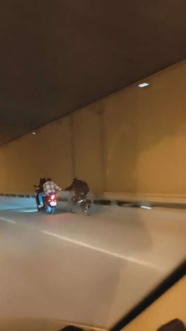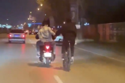 Bursa'da akan trafikte motosikletteki arkadaşına tutunarak ilerleyen bisiklet sürücüsü tehlikeye davetiye çıkardı.